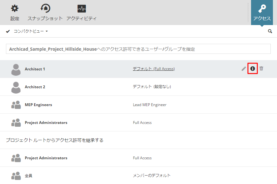 各コンテンツ項目にアクセスできるユーザーをBIMcloud Managerで確認できます。