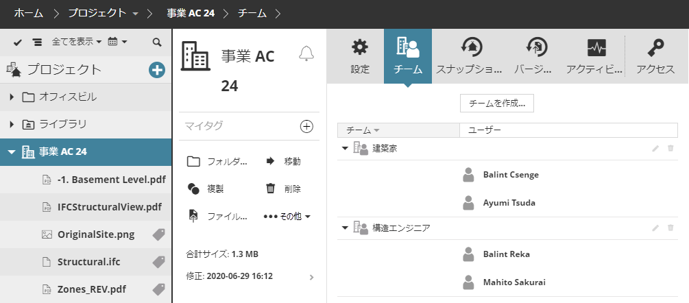 BIMcloudプロジェクトは、特別な種類のフォルダとして機能します。例えば、BIMcloudプロジェクトには、チームワークプロジェクト、任意の形式のファイル、任意の階層のサブフォルダを含めることができます。BIMcloudプロジェクトおよび/またはそのサブアイテムに、固有のユーザーチームを割り当てることができます。