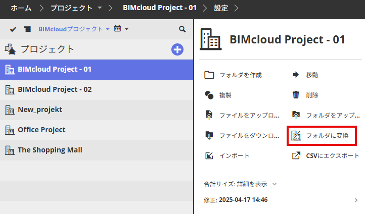 BIMcloudプロジェクトをフォルダに変換すると、チームおよび関連アクセスの定義は失われます(チームはBIMcloudプロジェクトにのみ関連し、BIMcloudの通常フォルダまたはその他の項目では意味がありません)。