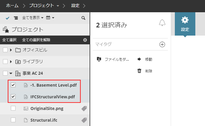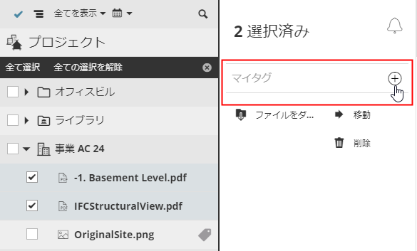 タグを追加できる項目は、[BIMcloudプロジェクト]ページに表示される全ての項目、つまりチームワークプロジェクト、BIMcloudプロジェクト、ライブラリ、フォルダ、アップロードしたファイルです。