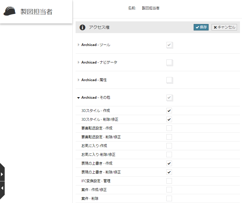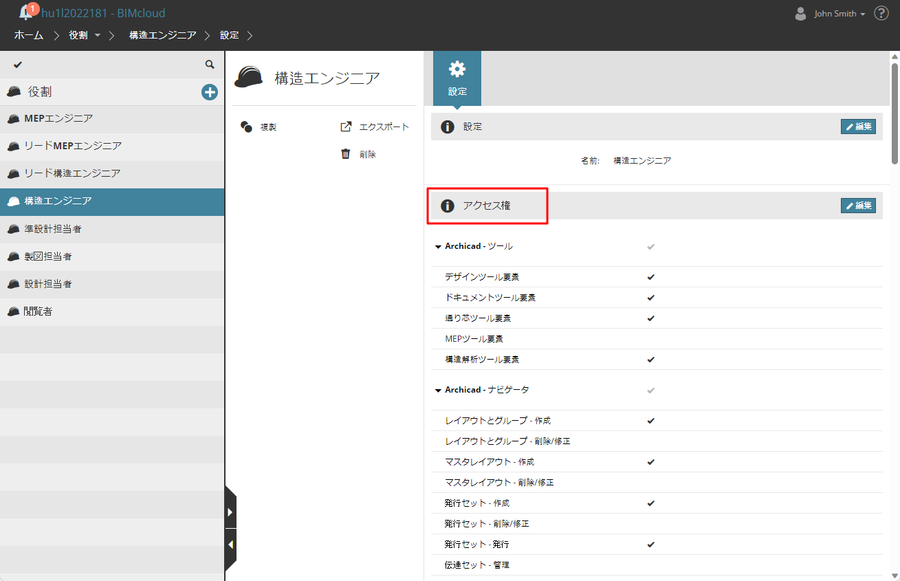 BIMcloud Managerの[役割]ページに移動し、役割を選択してその権限を確認します。