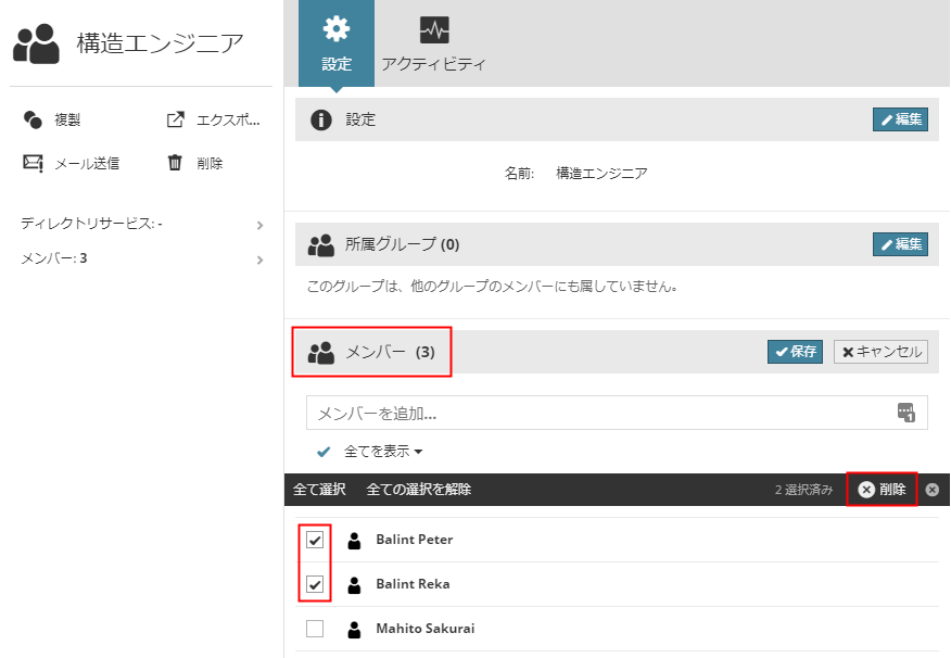 ユーザーグループの[設定]の[メンバー]部分で、[編集]をクリックします。