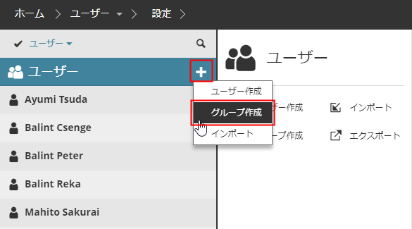 プラスをクリックしポップアップからグループ作成を選択します(ユーザーとグループルートを選択している場合は、[概要]パネルからこのコマンドを選択することもできます)。