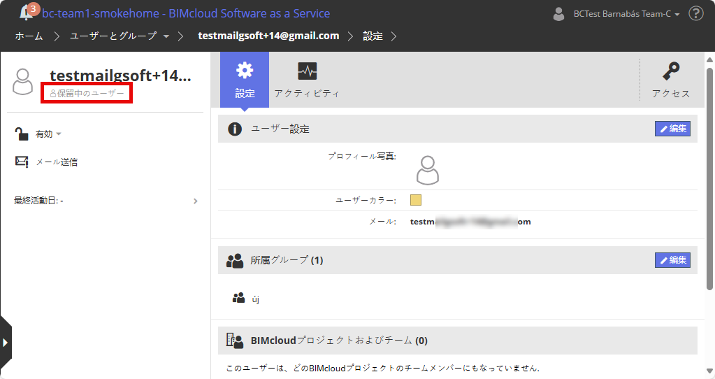 "保留中"のユーザーであっても、BIMcloudの管理者は、招待が受理されるまで待つ必要はなく、先に進み、権限、ユーザーグループのメンバーシップ、およびその他の設定を割り当てることができます。
