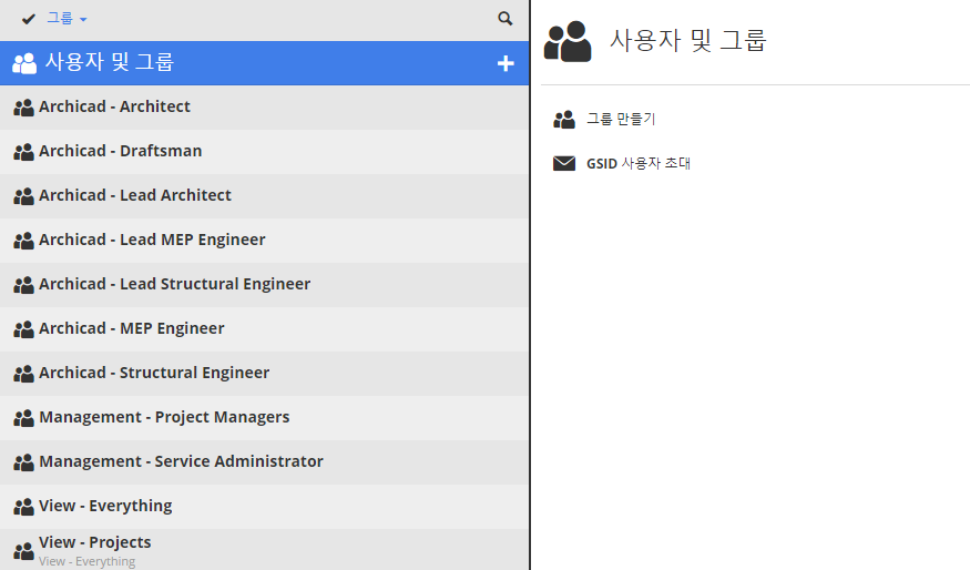 "보기" 그룹은 BIMcloud Manager의 웹 인터페이스와 해당 콘텐츠에 대한 보기 전용 권한입니다.