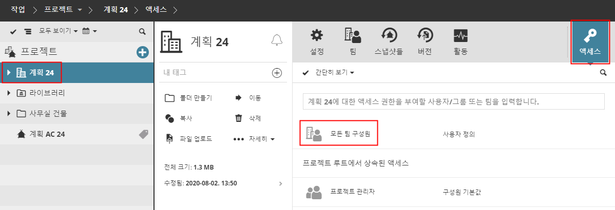 BIMcloud 프로젝트에 할당된 팀에 대한 권한 정의