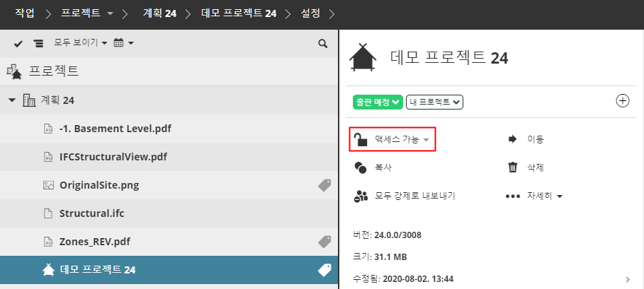 BIMcloud의 프로젝트 페이지에서 선택한 프로젝트의 상태를 확인할 수 있습니다.