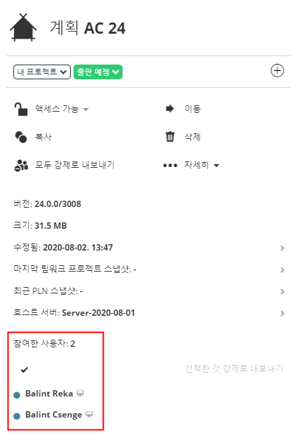 BIMcloud Manager의 프로젝트 페이지에서 팀워크 프로젝트를 선택합니다. 현재 참여한 사용자가 표시됩니다. 점 색깔은 이 프로젝트에서 각 사용자의 상태를 뜻합니다: