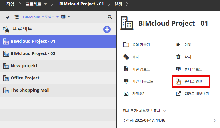 BIMcloud 프로젝트를 폴더로 변환하면 해당 팀 및 관련 액세스 정의가 손실됩니다. (팀은 BIMcloud 프로젝트에만 관련이 있으며 BIMcloud의 일반 폴더 또는 기타 항목에는 의미가 없습니다.)