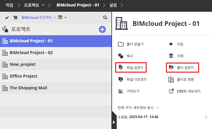 BIMcloud에 폴더 또는 파일 업로드하기