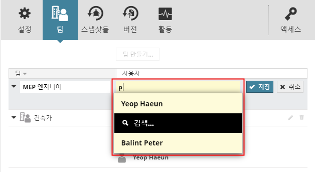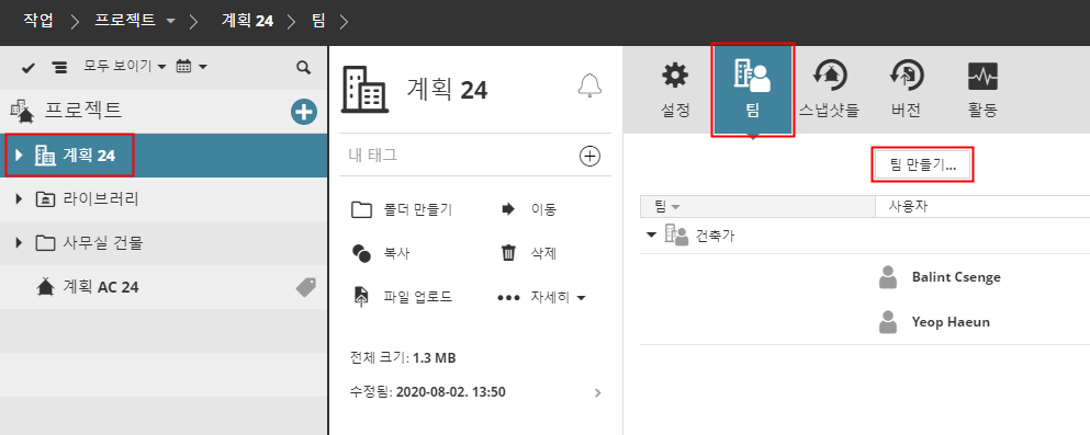 BIMcloud 프로젝트 팀 생성 또는 추가하기