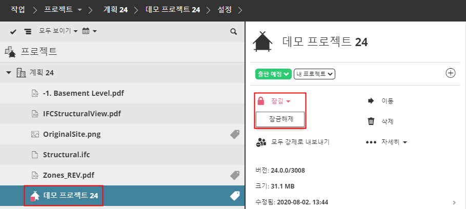 프로젝트가 잠겨 있는 동안에는 사용자가 변경 사항을 보내기/받기하거나 프로젝트 데이터를 변경할 수 없습니다.