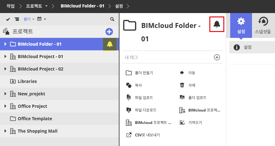 BIMcloud Manager의 프로젝트 페이지에서 이들 항목을 구독하면 BIMcloud의 파일과 폴더의 변경사항을 추적할 수 있습니다. “폴더”는 일반 폴더, BIMcloud 프로젝트, 또는 라이브러리 폴더일 수 있습니다.