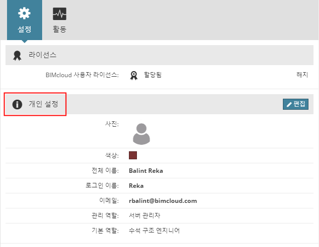 사용자 정의 필드를 정의한 경우 개인 설정 섹션에도 표시됩니다. (선택적 사용자 정의 필드는 BIMcloud Manager 설정에서, 서버 페이지 상에서 서버 관리자가 정의합니다.)