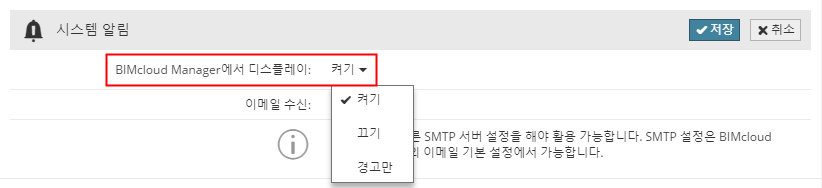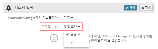 On: 필요한 경우 모든 시스템 알림(정보 및 경고 메시지)이 BIMcloud Manager의 관련 위치에 팝업으로 나타납니다.