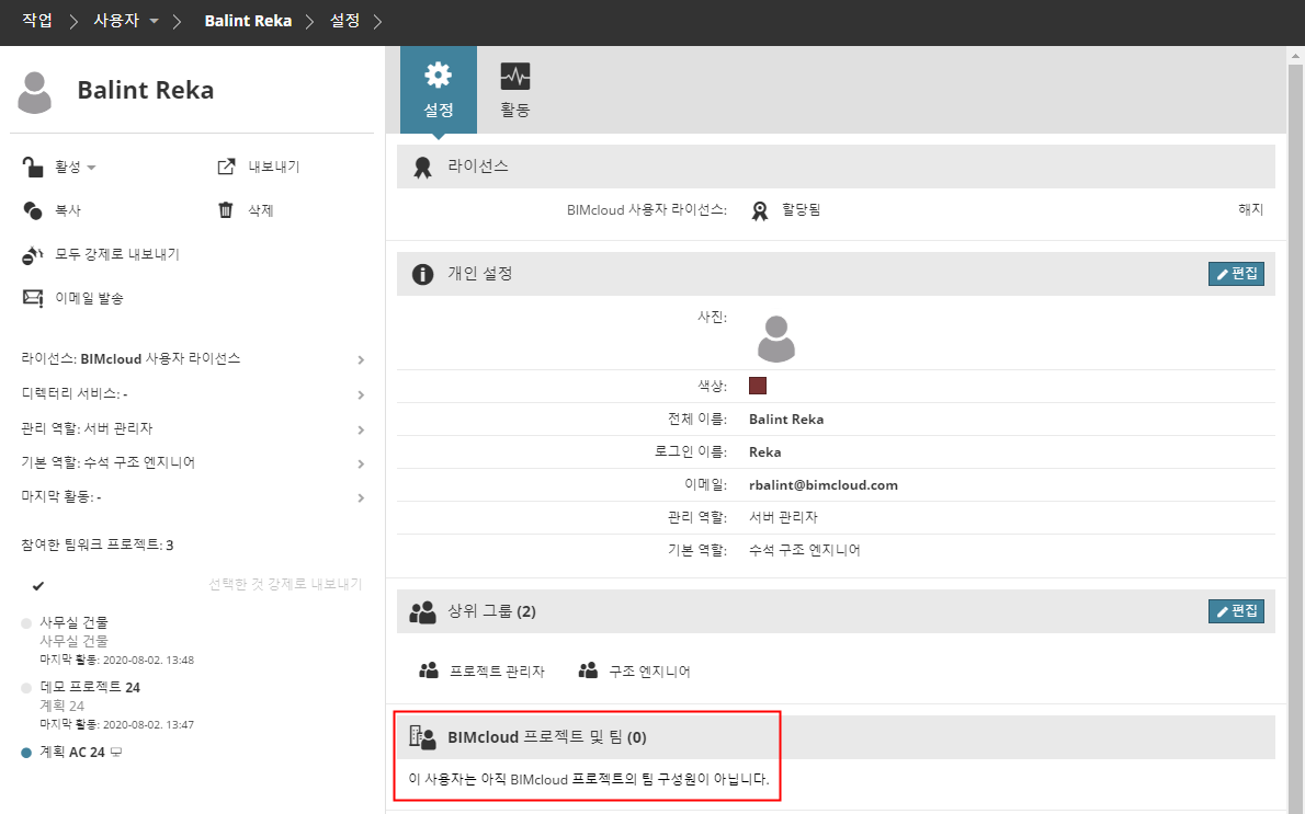 이 사용자가 소속된 BIMcloud Projects와 관련 팀을 나열합니다.