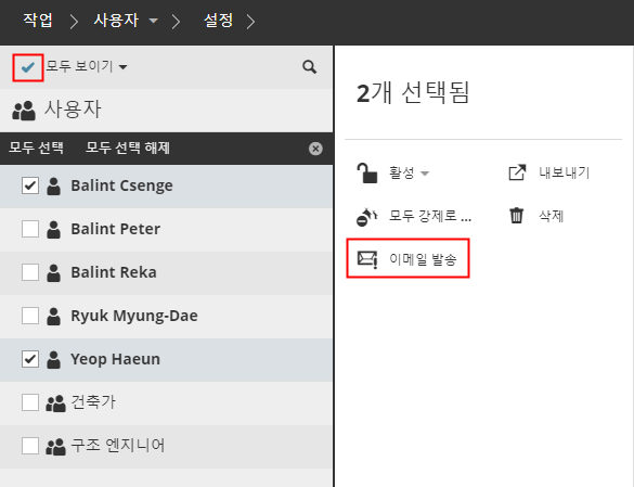 선택된 BIMcloud 사용자에게 이메일 보내기