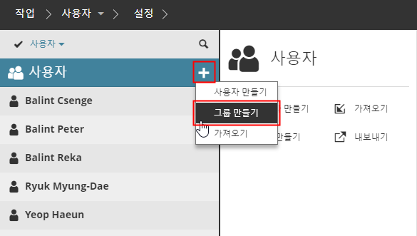 플러스 표시(+) 팝업을 클릭하고 그룹 만들기를 선택합니다. (사용자 및 그룹 루트를 선택한 경우 요약 패널에서 명령을 선택할 수도 있습니다.)