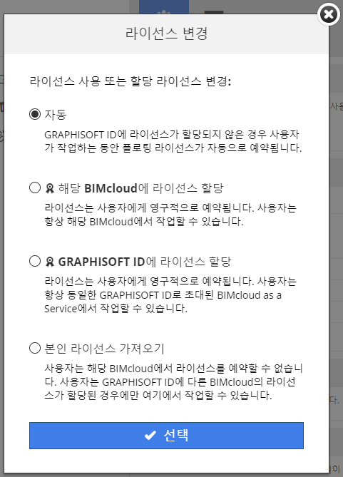 주: 이 명령은 GSID를 통해 연결된 BIMcloud 사용자에게만 사용할 수 있습니다.원하는 라이선스 유형을 선택한 다음 선택을 클릭하세요.