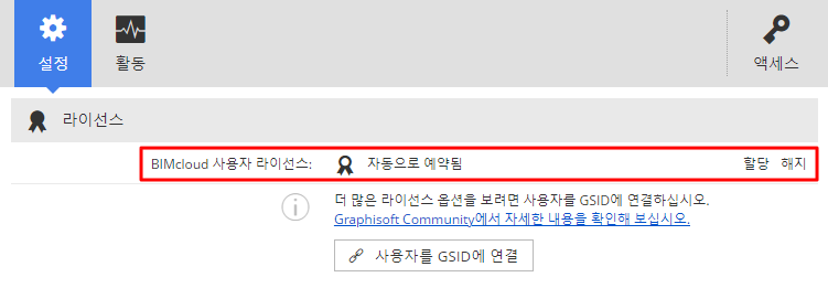 클라우드 라이선스 대신 기존 BIMcloud SaaS 라이선스를 설정한 경우 아래에 설명한 대로 BIMcloud Manager에서 라이선스를 관리합니다.