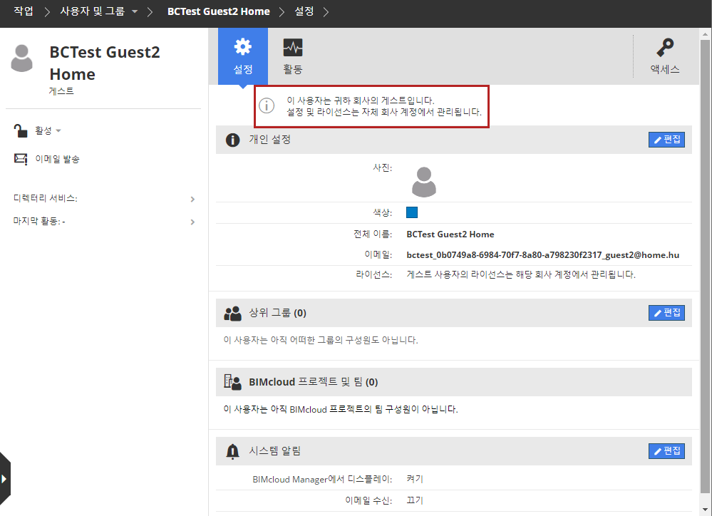 회사 관리자는 다른 회사의 사용자를 BIMcloud에 게스트로 초대할 수 있습니다. (Graphisoft 회사 계정에서 이 작업을 수행할 수 있습니다.)