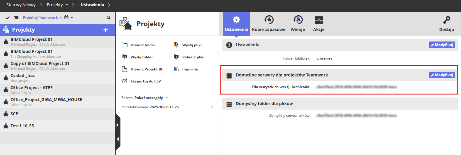 Nie możesz zmienić tego serwera tutaj. Aby zmienić serwer plików (tylko główny administrator), przejdź do strony Serwery BIMcloud Manager.