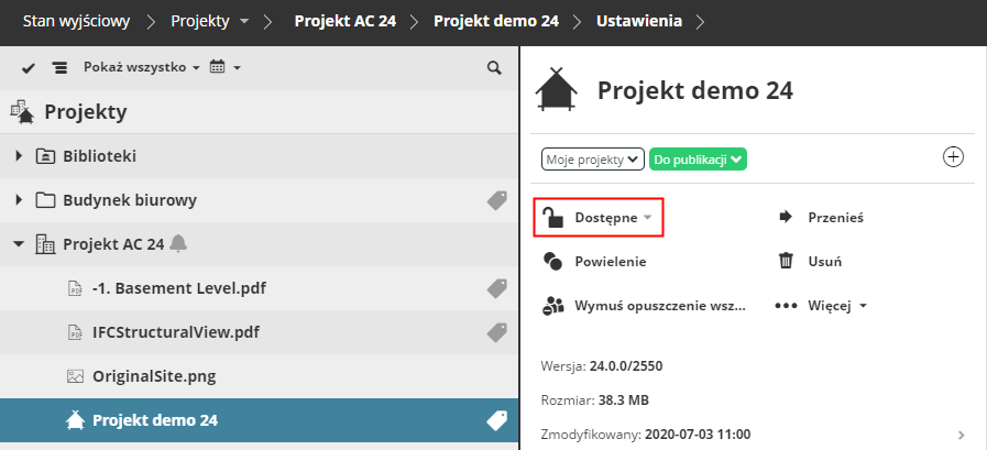 Na stronie projektu BIMcloud, status zaznaczonego elementu projektu pokazuje