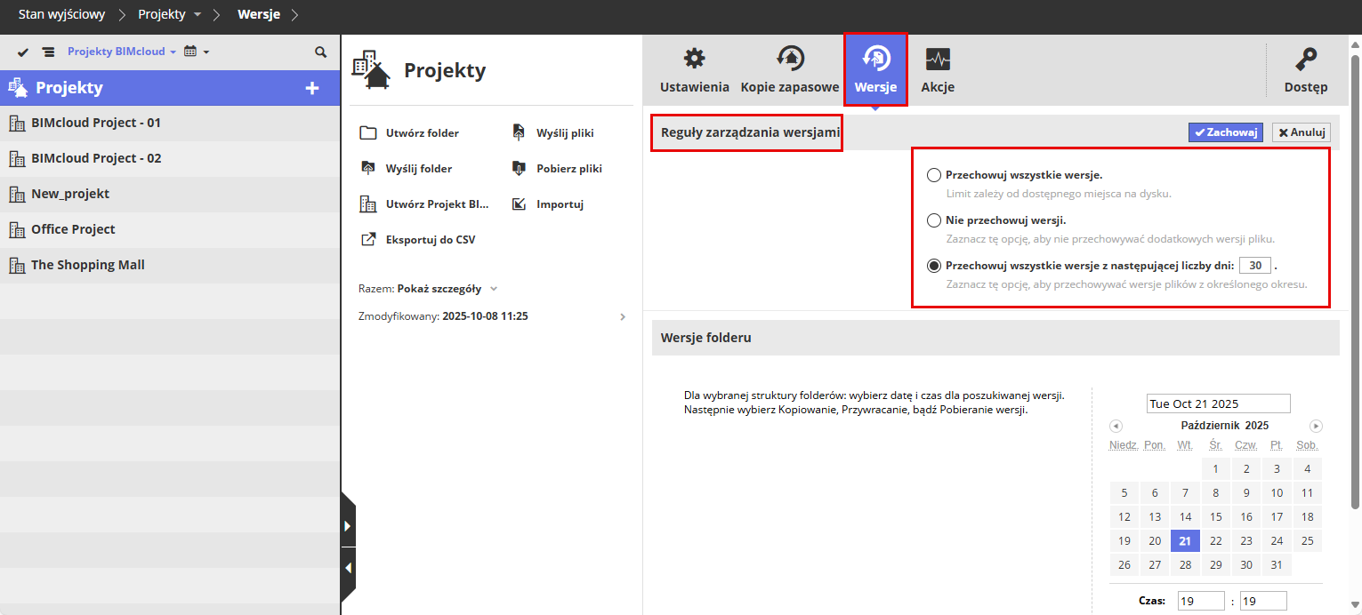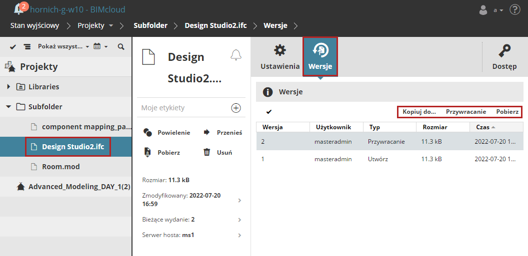 Przechowywanie i odzyskanie poprzednich wersji plików w BIMcloud