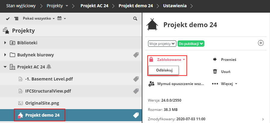 Po ponownym odblokowaniu projektu użytkownicy mogą z powrotem pracować w projekcie i wysyłać/pobierać zmiany.