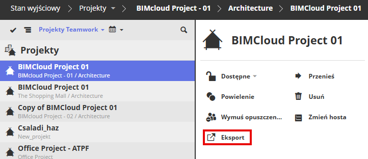Użyj tej funkcji, aby pobrać Projekt Teamwork lub Bibliotekę na komputer w formacie .BIMProject lub .BIMLibrary).