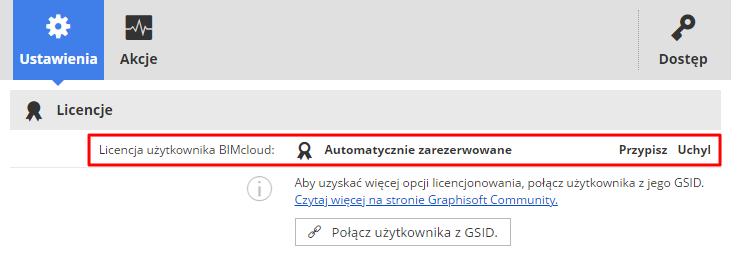 Administrator może Odwołać ręcznie przypisaną licencję każdego użytkownika w BIMcloud Manager (na stronie „Użytkownicy i grupy” – panel „Ustawienia” lub na stronie „Serwery” – „BIMcloud Manager” – panel „Ustawienia”). W takim przypadku, zostanie automatycznie zarezerwowana licencja, jeśli będzie dostępna.