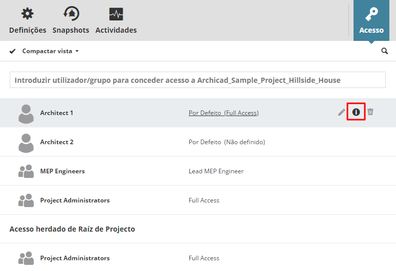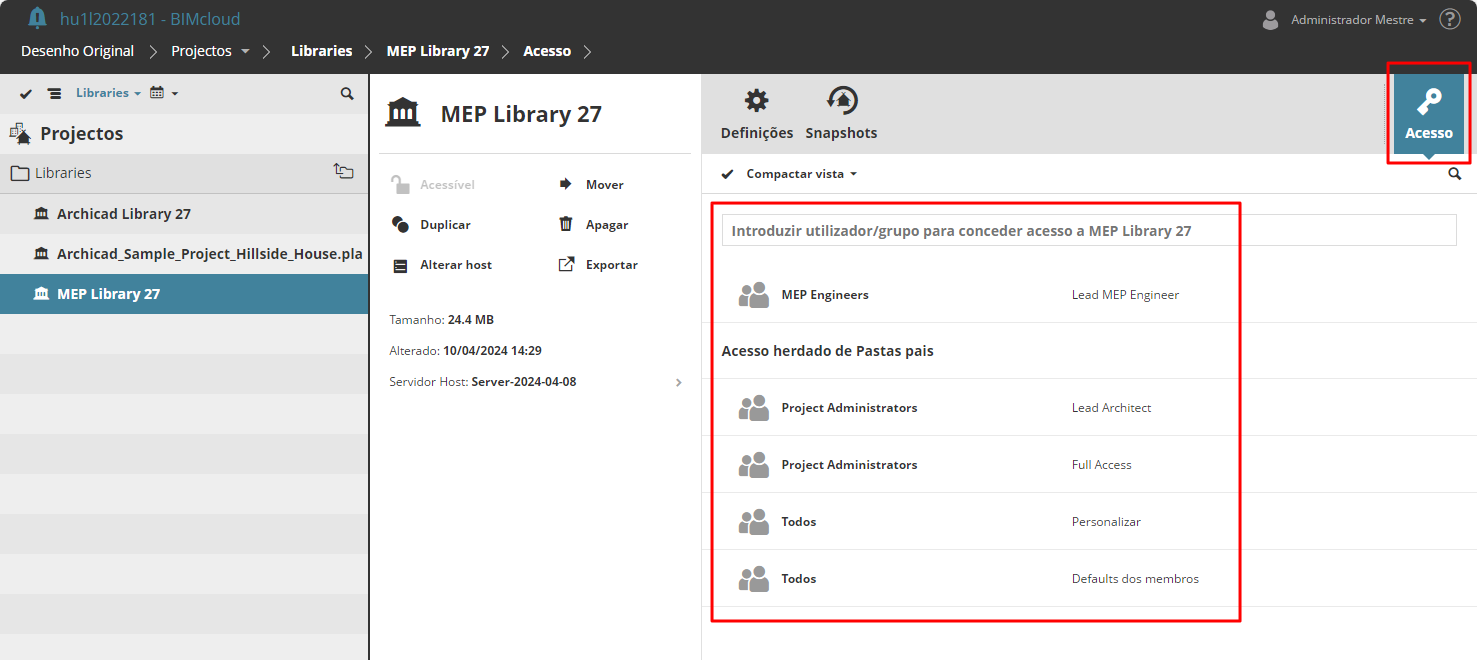 Seleccione um item de conteúdo no BIMcloud Manager. O painel Acesso mostra quais os utilizadores ou grupos que têm acesso a esse item.