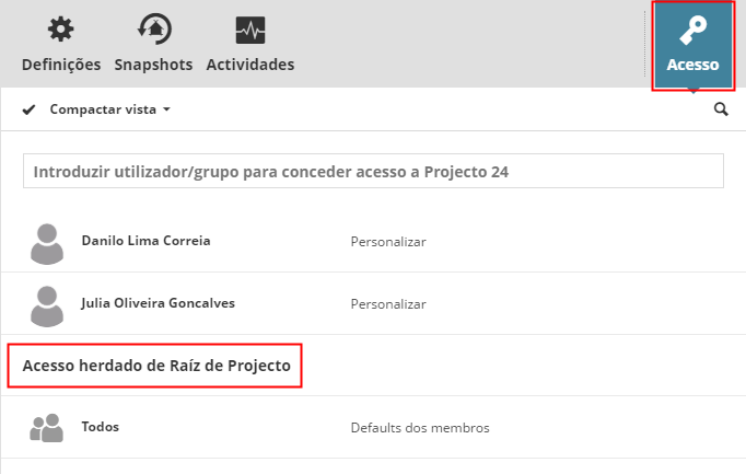 - A secção inferior ("Acesso herdado das pastas principais") apresenta os utilizadores/grupos que podem aceder a este item porque já têm acesso à pasta principal. O Acesso atribuído a um nível superior da hierarquia de pastas é herdado em sentido ascendente, por todos os seus elementos descendentes.