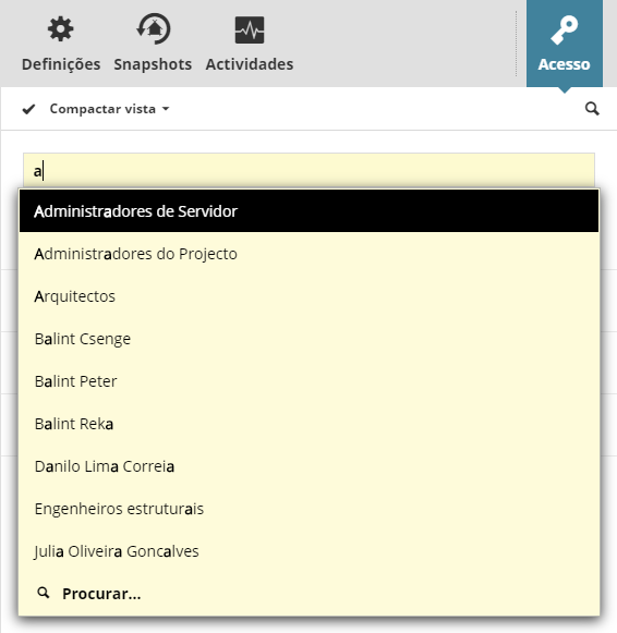 Abra o painel Acesso e comece a introduzir o nome de quem o pode aceder (utilizador ou grupo), ou clique em Procurar. Para atribuir acesso a todos os utilizadores, utilize o grupo especial Todos.