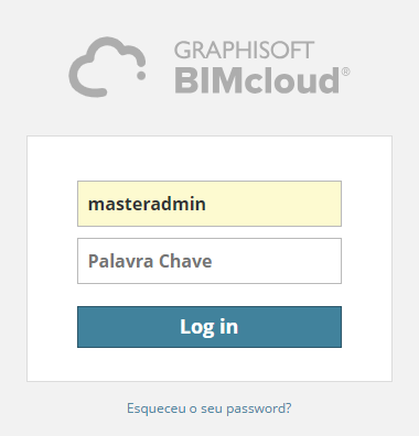 O nome de login para o Administrador Mestre é: masteradmin. A password foi definida durante a instalação do servidor no configurador do BIMcloud Manager. Se se tiver esquecido da password, volte a executar o Configurador do BIMcloud Manager e defina uma nova password.