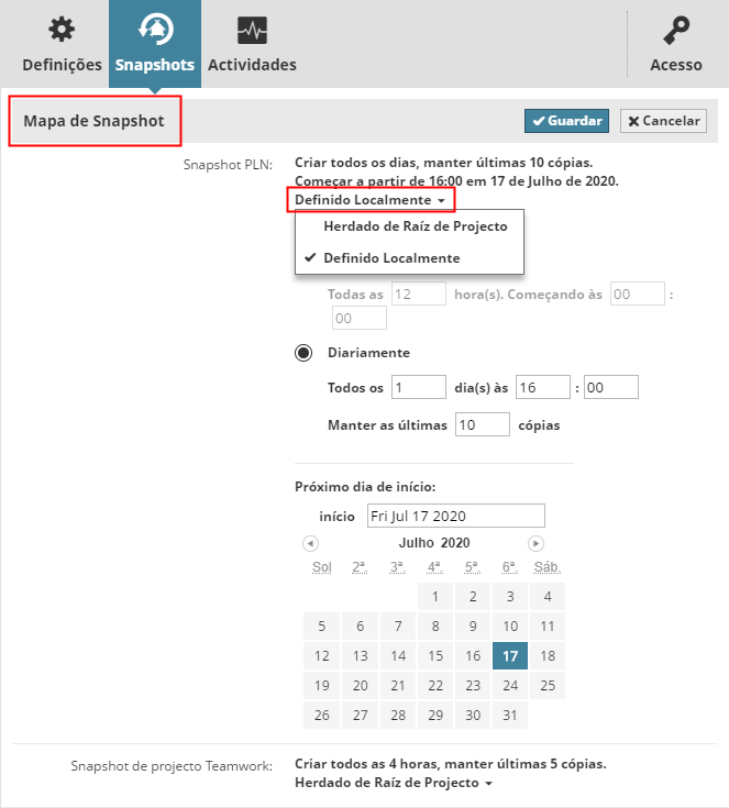 Por defeito, todos os projectos e bibliotecas Teamwork herdam o calendário de Snapshots da sua pasta principal.