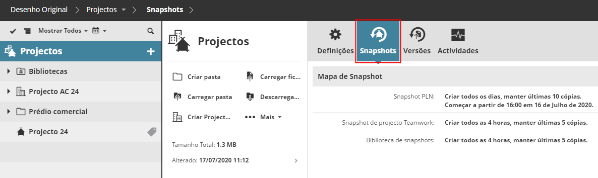Agende snapshots automáticos no painel Snapshots, ao nível da raiz dos Projectos, de qualquer pasta ou de um projecto Teamwork individual.
