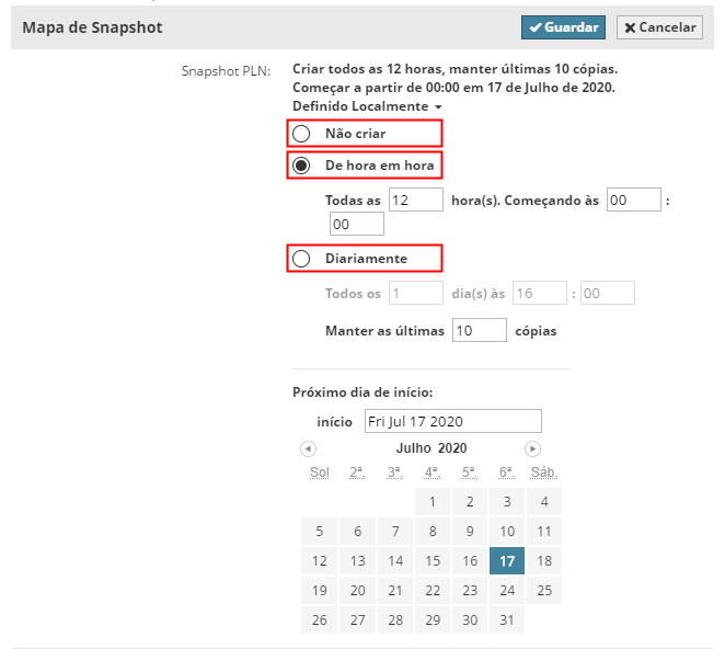 De hora em hora: O snapshot será criado de hora em hora, com base nas definições abaixo