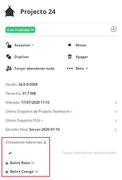 Na página Projectos do BIMcloud Manager, seleccione um projecto Teamwork. São listados os utilizadores actualmente ligados. A cor do ponto indica cada estado do utilizador para este projecto: