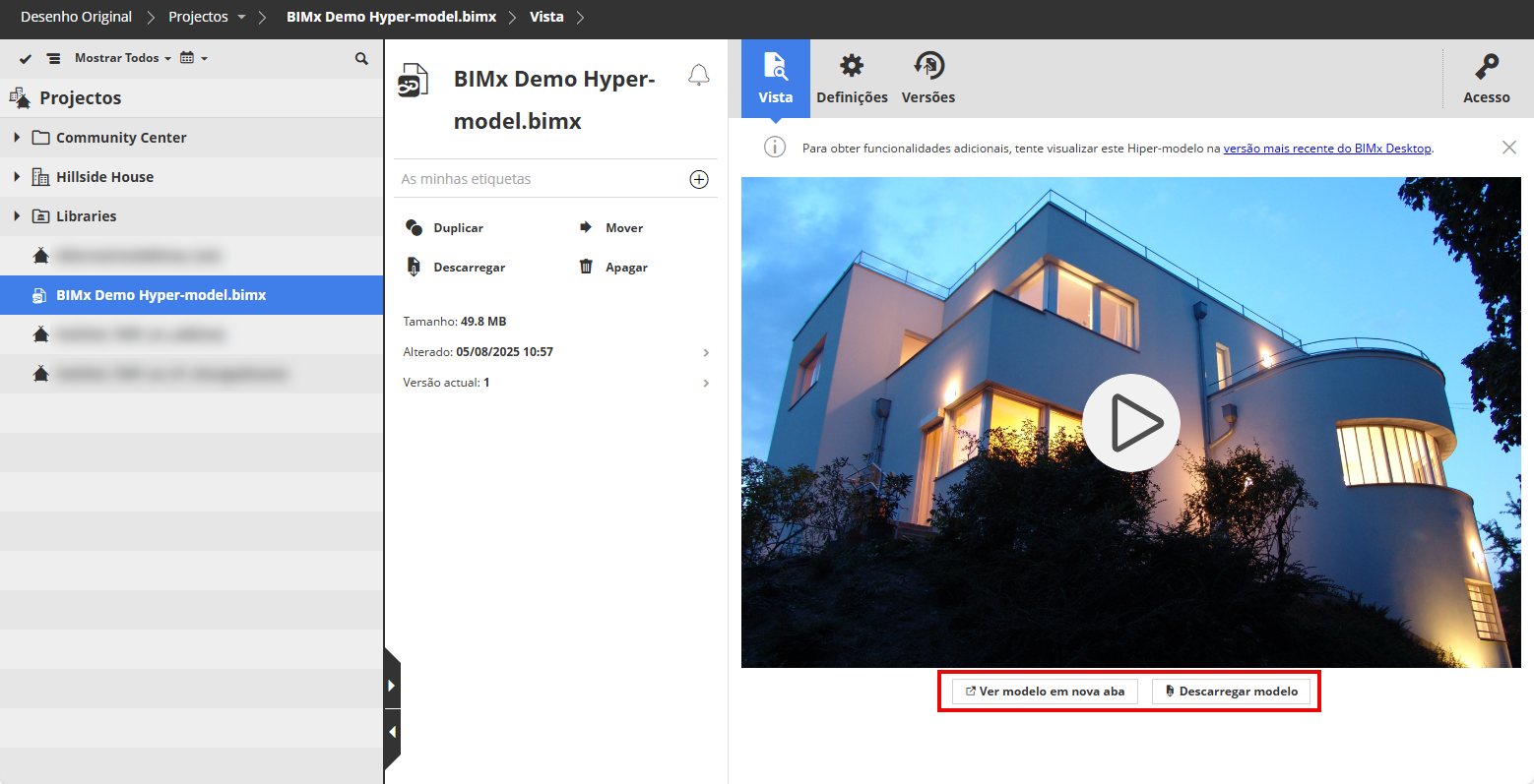 Nota: Para visualizar o modelo BIMx, os seus componentes BIMcloud (BIMcloud Manager, BIMcloud Servers) têm de estar actualizados. No caso de um ou mais componentes estarem desactualizados, a página Visualizar alerta-o para a necessidade de actualizar.