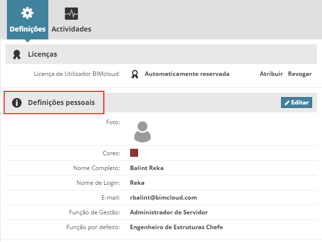 Se tiverem sido definidos campos personalizados, estes irão também aparecer na secção de definições pessoais. (Campos personalizados opcionais são definidos pelo Administrador de Servidor na página Servidores, em Definições de BIMcloud Manager.)