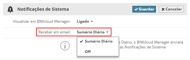 Em: Todas as Notificações de Sistema (mensagens de Informações assim como de Aviso) serão apresentadas se necessário nas localizações relevantes do BIMcloud Manager.