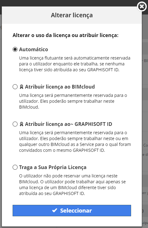 Nota: Este comando só está disponível para utilizadores BIMcloud ligados via GSID.Escolha o tipo de licença desejado, depois clique em Seleccionar.