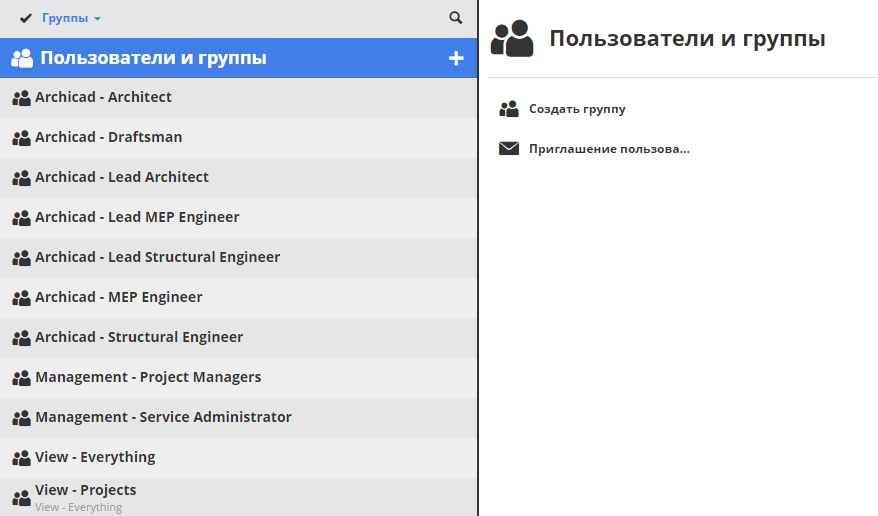 Группы “Просмотра” служат для настройки прав просмотра веб-интерфейса BIMcloud Manager и всех данных.