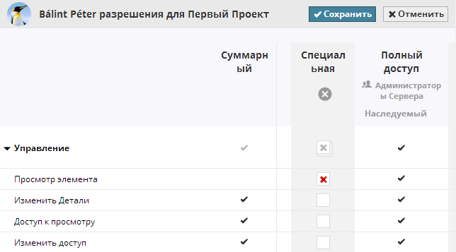 При этом будет открыта страница настройки прав выбранного пользователя: чтобы аннулировать любое право, дважды щелкните на соответствующем маркере (он будет помечен красным крестом).