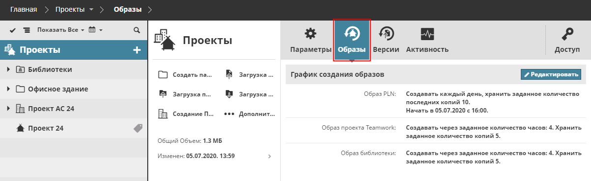 Настроить создание образов можно в панели Образов на уровне корня Проектов, любой папки или отдельного проекта Teamwork.