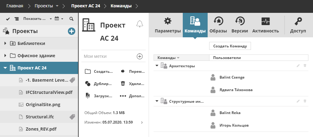 Проекты BIMcloud являются особым типом папок. Например, ваш Проект BIMcloud может включать Проекты Teamwork, файлы любого формата и подпапки в любой иерархии. Вы можете связать уникальную Команду пользователей с Проектом BIMcloud и/или его элементами.