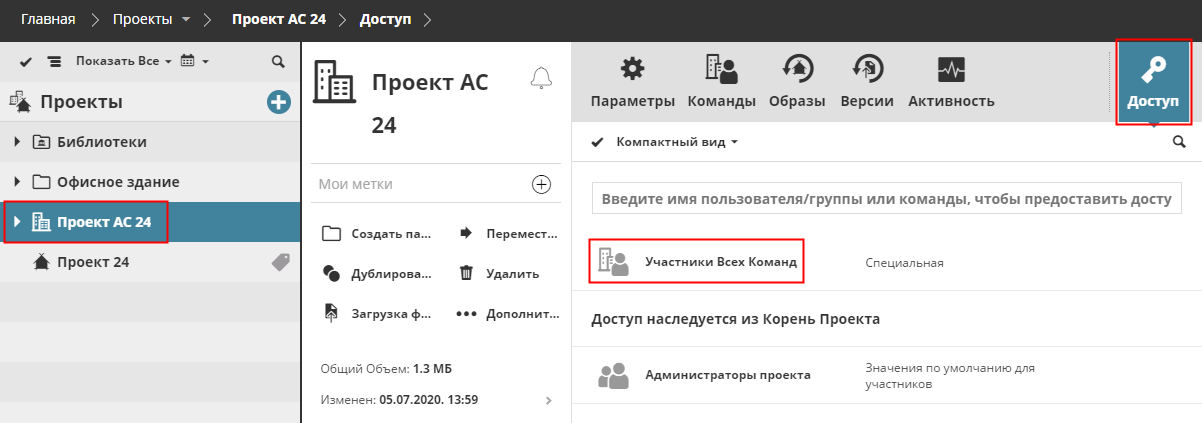 Вы можете настраивать права доступа для Команд, связанных с Проектами BIMcloud