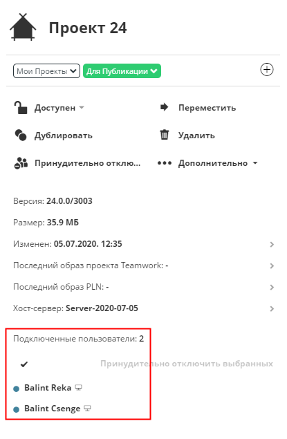 На странице Проектов в BIMcloud Manager выберите проект Teamwork. В результате будет отображен список подключенных к этому проекту пользователей. Цветные точки соответствуют статусу пользователей в данном проекте: