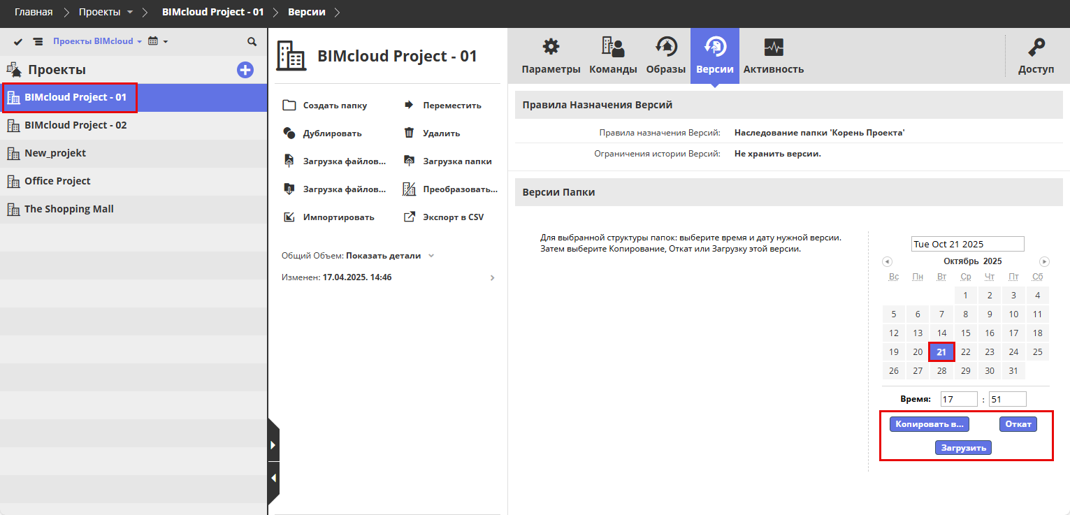 Прим.: Скопированная папка будет содержать только последнюю версию каждого из загруженных в нее файлов.Откат: для каждого файла в этой папке будет восстановлено состояние на выбранную дату.